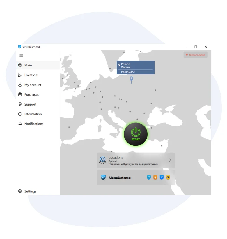 VPN Unlimited for PC has a really intuitive interface, so you shall have no problems using it. All it takes to establish a secure VPN connection is clicking the big blue Start button!