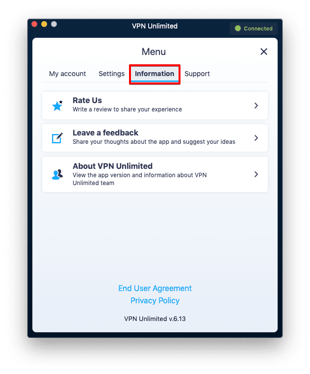 اگر در مورد برنامه VPN ما برای Mac به کمک نیاز دارید یا میخواهید قابلیت بازخوردهای اتصال را مدیریت کنید، آخرین برگه Support (پشتیبانی) را بررسی کنید: