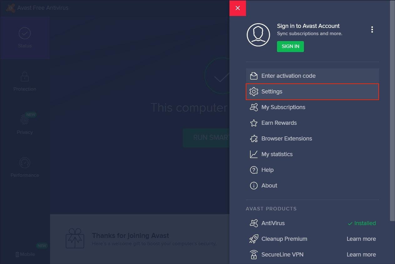 1. Open Avast Antivirus and click on the Menu icon > Settings: