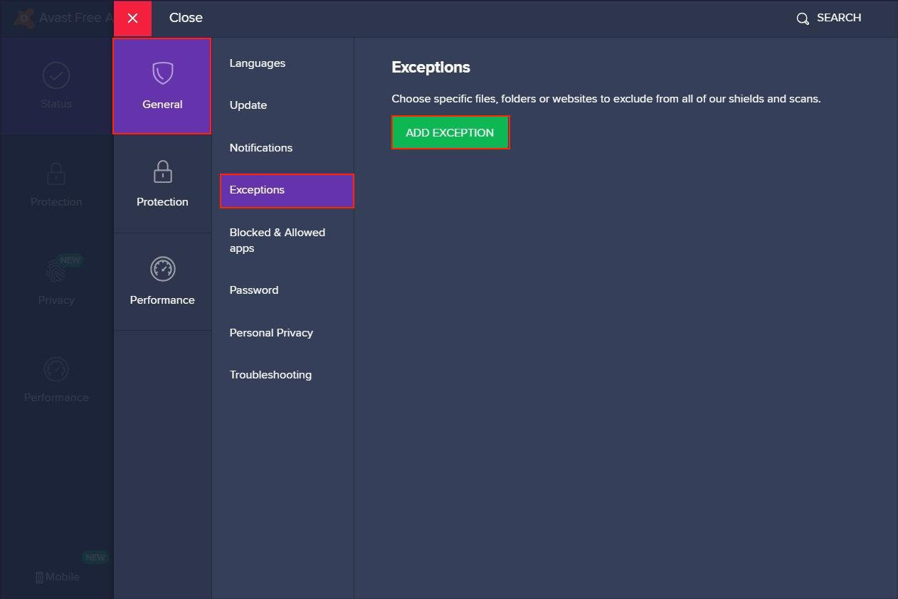 You’ll need to add VPN Unlimited to exclusions both in general and Avast Firewall setting. First, let’s find out how to do that in General settings: