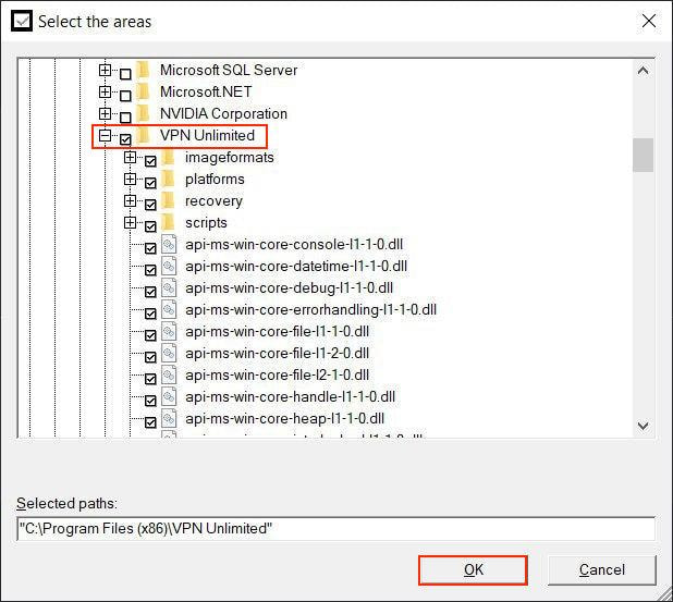 5. Click OK to proceed, and VPN Unlimited folder name will appear in File paths.