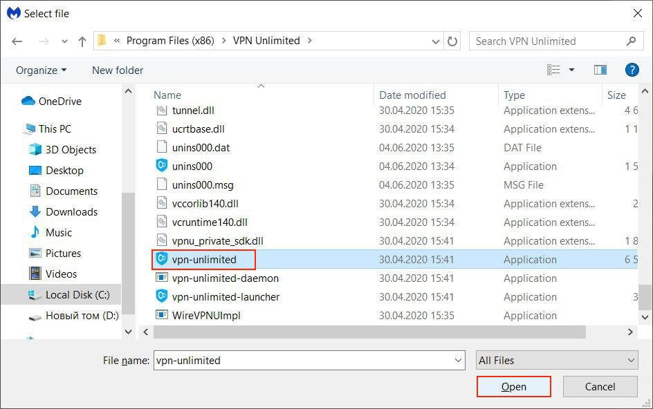 3. Navigate to Local Disc (C:) > Program Files > find VPN Unlimited folder > choose vpn-unlimited and click Open.