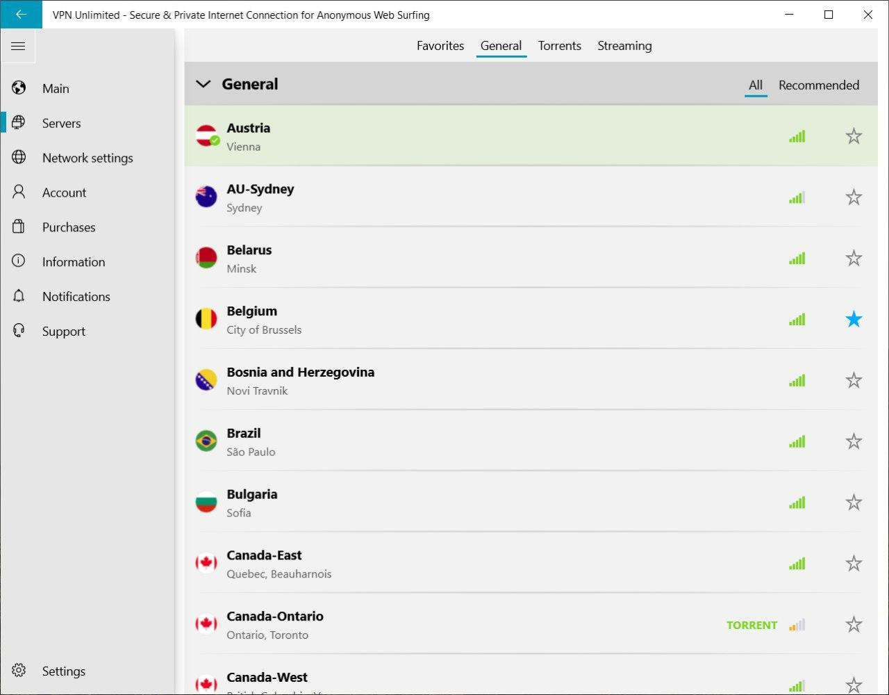 Os servidores favoráveis ao P2P (Download P2P) são marcados com uma etiqueta especial "TORRENT" (TORRENT) ao lado dos seus nomes na lista All servers (Todos os servidores), o que facilita a identificação de localizações que suportam download P2P seguro e anónimo.