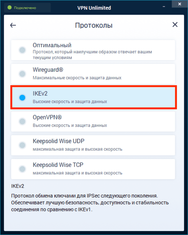 IKEv2 зарекомендовал себя как чрезвычайно безопасный VPN протокол, который демонстрирует достаточно высокую стабильность и скорость соединения. Более подробную информацию о функциях и преимуществах IKEv2 протокола вы можете найти в статье Что такое IKEv2?